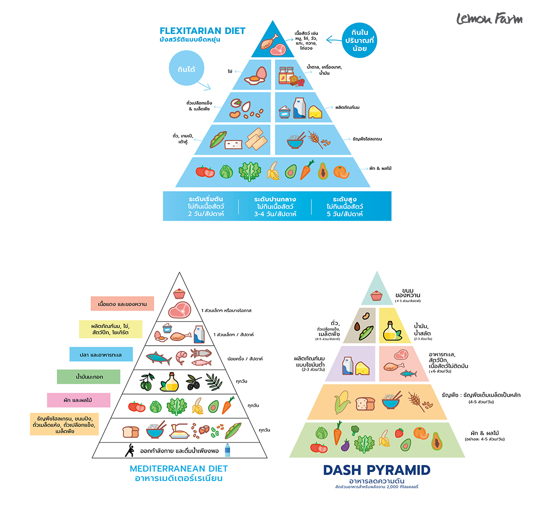 (1) อาหารแบบกินพืชเป็นหลัก (whole food plant-based) หรืออาจผนวกการกินปลา โปรตีนเนื้อขาวบ้างสัปดาห์ละ 1-2 ครั้ง (Flexitarian Diet)