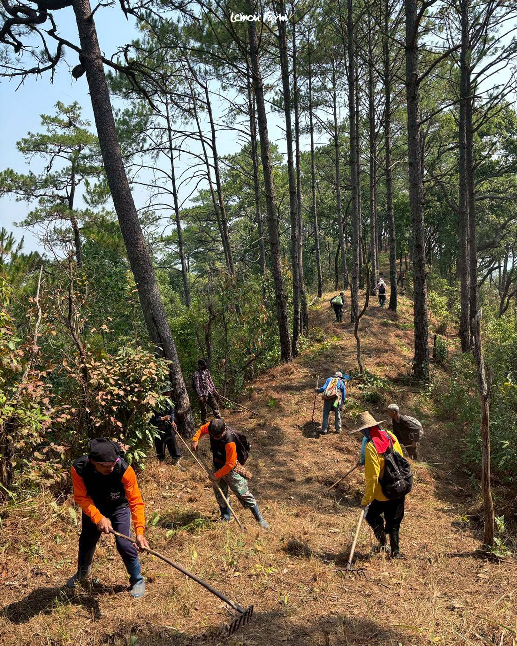 ชาวบ้านต้องเดินขึ้นภูเขา แบกอุปกรณ์ ใช้แรงกายและเวลาทำแนวกันไฟ มีความกว้างประมาณ 5–6 เมตร ทอดยาวตามแนวสันเขา เชื่อมต่อกันระหว่างหมู่บ้าน รวมระยะทางกว่า 70 กิโลเมตร ในช่วงเฝ้าระวัง ชุมชนยังจัดเวรยามเฝ้าระวังไฟป่าจนผ่านฤดูร้อนของทุกปี