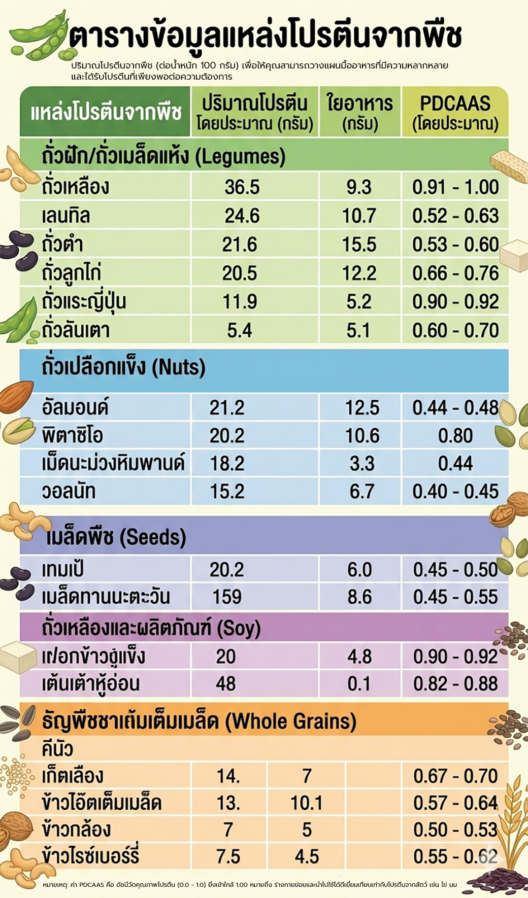 “เมื่อรู้วิธีจับคู่ให้ได้โปรตีนคุณภาพแล้ว อีกสิ่งที่ลืมไม่ได้คือการกะ ‘ปริมาณ’ ให้เพียงพอในแต่ละวันค่ะ เพื่อให้คุณสนุกกับการ Mix & Match วัตถุดิบได้อย่างมั่นใจ ตารางด้านล่างคือ ตัวอย่างปริมาณโปรตีนจากพืชยอดนิยม เพื่อใช้วางแผนมื้ออร่อยแบบง่ายๆ กัน”