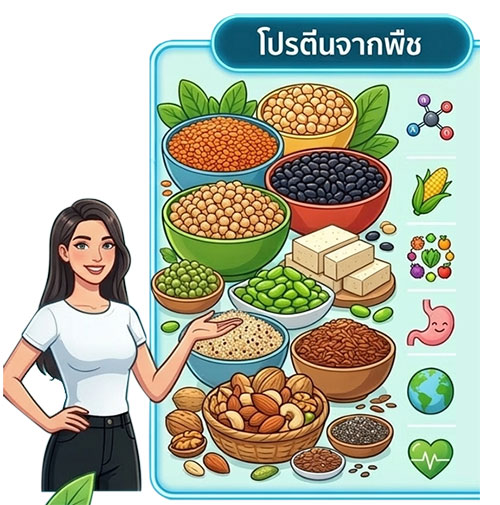🥜โปรตีนจากพืช : ส่วนใหญ่มักจะมีกรดอะมิโนจำเป็นบางชนิดไม่ครบถ้วน (Incomplete Protein) แต่มีข้อได้เปรียบที่โดดเด่นคือไม่มีคอเลสเตอรอล ไขมันต่ำ และอุดมไปด้วยใยอาหาร (Fiber) รวมถึงสารพฤกษเคมี (Phytochemicals) ที่ช่วยต้านอนุมูลอิสระซึ่งเป็นปัจจัยสำคัญในการลดความเสี่ยงโรคไม่ติดต่อเรื้อรัง (NCDs)