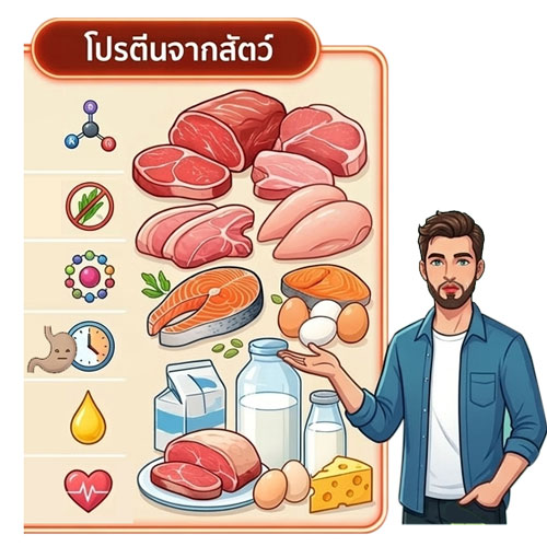 🐔โปรตีนจากสัตว์ : จัดเป็นโปรตีนสมบูรณ์ (Complete Protein) เนื่องจากมีกรดอะมิโนจำเป็นครบถ้วนตามความต้องการของร่างกาย ทั้งยังมีความสามารถในการย่อยและดูดซึมสูง นอกจากนี้ยังเป็นแหล่งสำคัญของวิตามินบี 12 ซึ่งไม่พบในพืช อย่างไรก็ตาม โปรตีนจากสัตว์มักมาพร้อมกับไขมันอิ่มตัวและคอเลสเตอรอล ซึ่งหากได้รับไขมันอิ่มตัวในปริมาณที่มากเกินไปอาจส่งผลต่อสุขภาพในระยะยาวได้