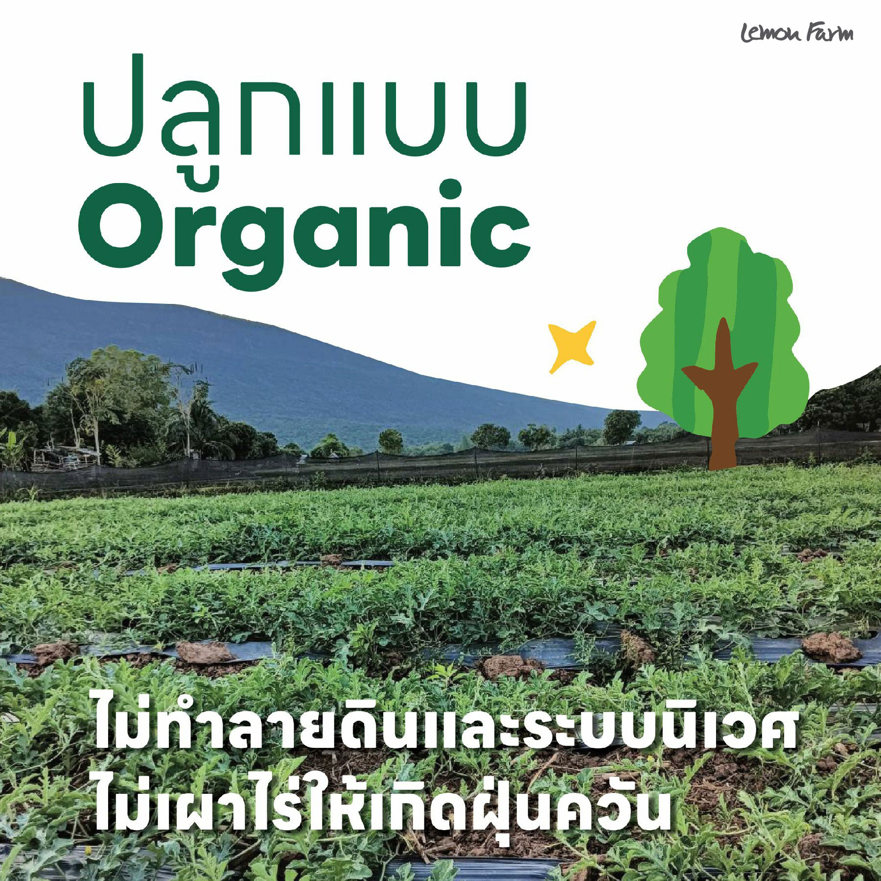 กว่าจะเป็นแตงโม Organic ต้องผ่านการปลูกในระบบเกษตรอินทรีย์ภายใต้มาตรฐาน Lemon Farm Organic PGS ที่มีข้อกำหนดมาตรฐานเข้มงวด เช่น การห้ามเผาแปลงเพื่อเตรียมการผลิต ทำให้ช่วยปรับปรุงคุณภาพหน้าดิน โดยจุลินทรีย์จะย่อยสลายตอซังข้าวช่วยคืนธาตุอาหารในดิน ทำให้ดินอุดมสมบูรณ์ ทดแทนการใช้ปุ๋ยเคมีและยังช่วยลดมลภาวะทางอากาศ